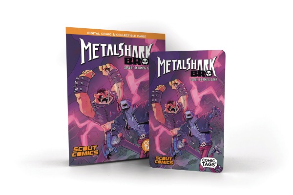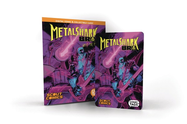 Making digital comics collectible! This plastic collectible card that contains a PDF of the complete Metalshark Bro Volume 1 graphic novel! What the Fin! If you have no idea what we're blathering about, here's the liner notes summary: a traditional shark stumbles upon Satan's nephew and is forcibly given anthropomorphic qualities. With his newfound human physique and propensity for violence, he's tasked with collecting the souls of those that have sworn allegiance to Satan. The only problem? He just wants to be a normal shark again! Naturally, he swears bloody vengeance and, uh, a whole lot of death ensues!